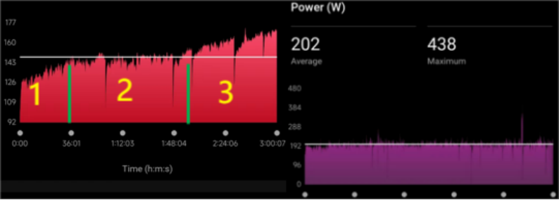 一次骑行运动中的功率(右)、心率(左)数据记录:对外输出恒定的功率(如以相同配速跑步或骑行),随着疲劳程度增加,运动员的心率会逐渐上升