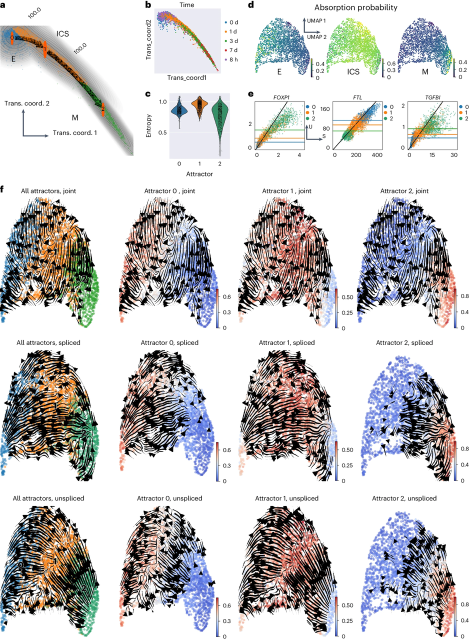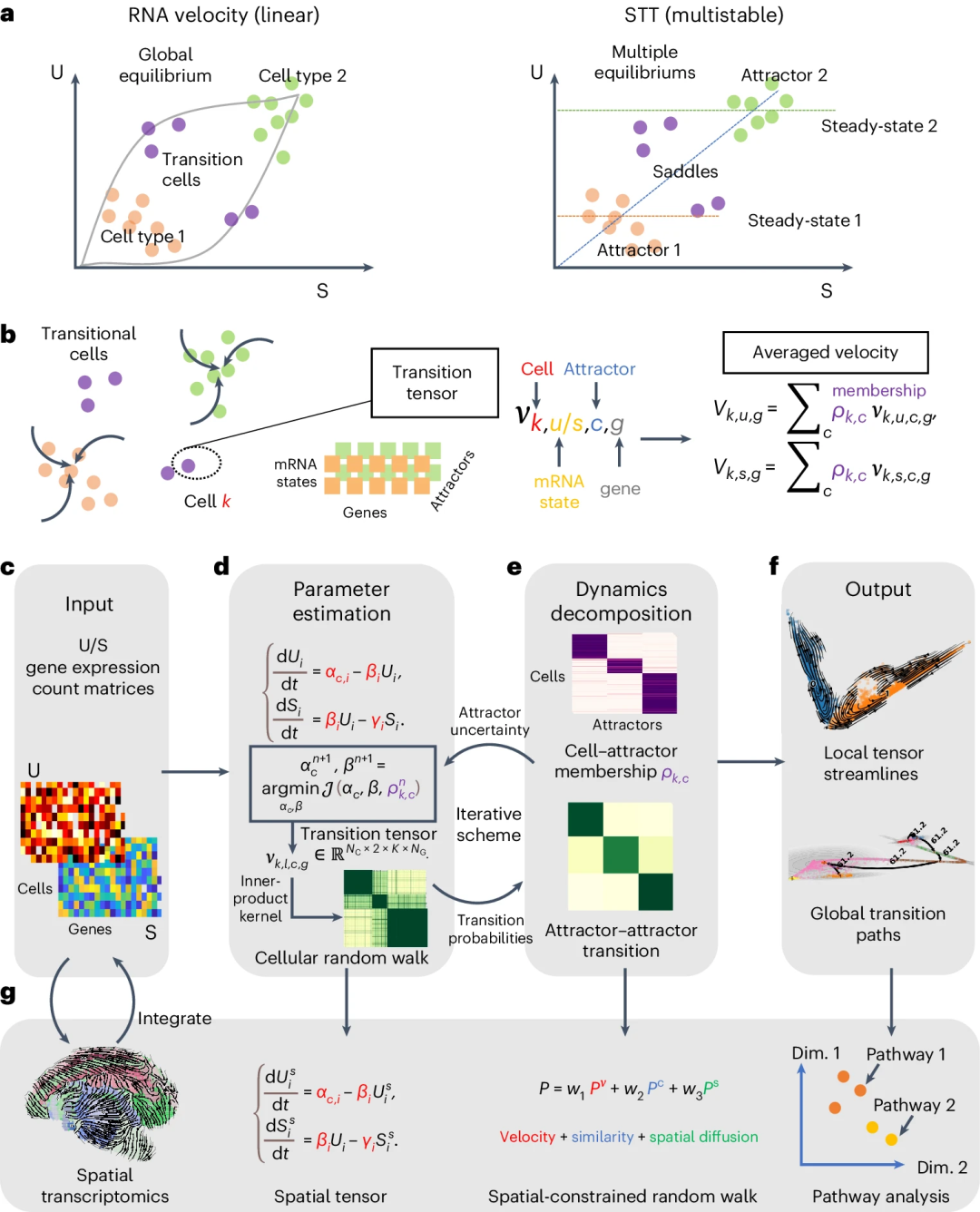 a.对比RNA速度(线性和单一平衡)与STT张量模型(多稳态和多个吸引子)。 b.通过平均细胞在不同吸引子中的所属关系,定义转移张量和诱导的RNA速度。 c–f.STT的工作流程。 c.输入的U和S计数矩阵。 d,e.转移张量的动力学参数估计(d)与动力学分解和粗粒化(e)之间的迭代方案。 f.STT的输出。 g.使用STT分析空间转录组学数据,其中基于空间细胞坐标的空间相似性核与张量诱导和基因表达诱导的核相结合,以推断细胞在吸引子中的所属关系。在路径相似性图中,Dim.表示降维后的坐标。
