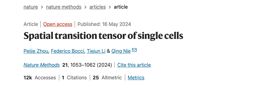 论文题目:Spatial transition tensor of single cells 论文来源:Nature Methods 论文链接:https://www.nature.com/articles/s41592-024-02266-x