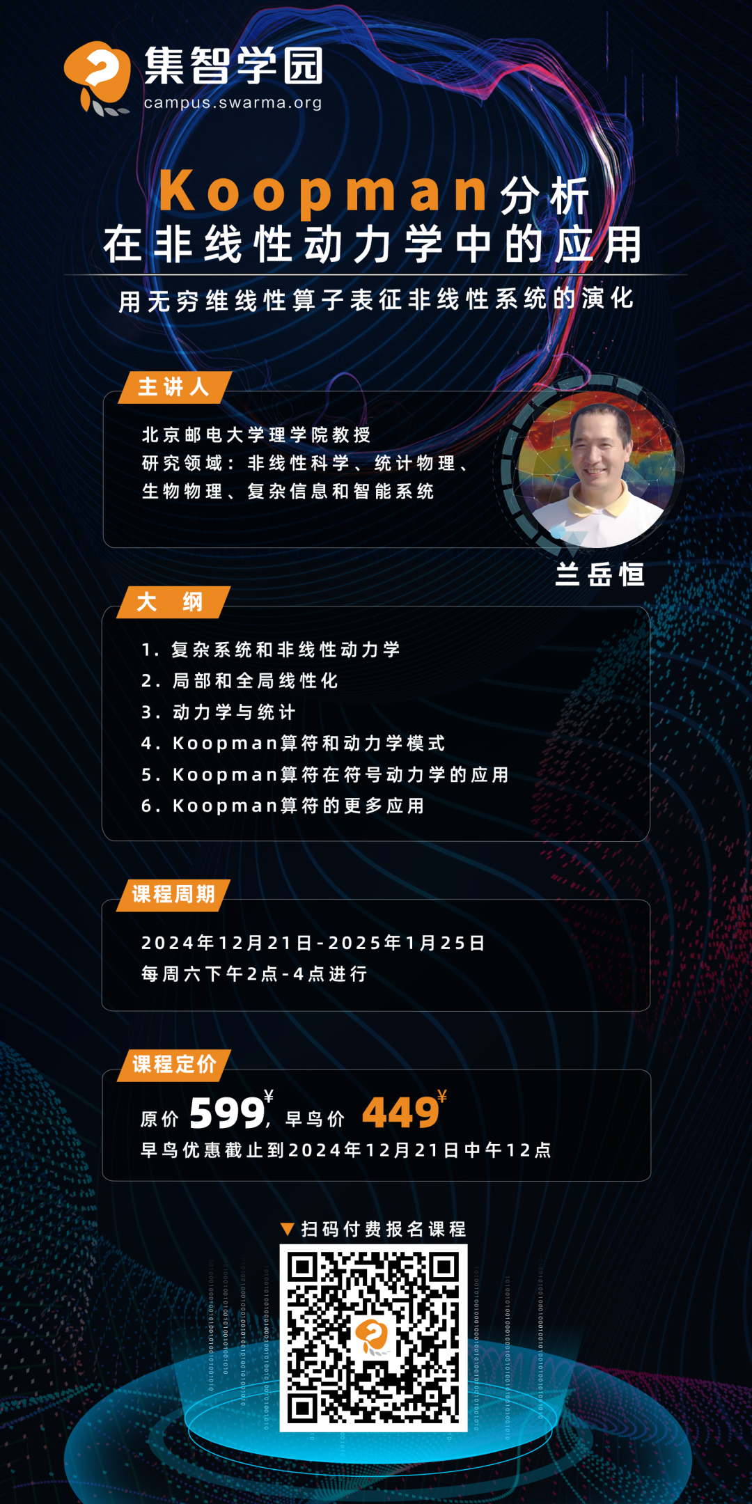 关于Koopman算符,还有很多重要的研究成果和思想值得我们学习,同时也有很多问题值得我们去解决。为此,集智学园邀请了兰岳恒教授开设相关课程,从Koopman算符的定义出发,讲述其定义、基本性质和谱特征的数值计算方法,以及在几个典型非线性系统中的应用。邀请关注这一领域发展的同学加入,共同探讨。