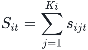 用数学的语言来描述,模型的基本设置就是,市场中有 N 个企业。假设每个足够大的公司都由特定数量的子单元(即产品)组成,每个子单元都在不同的独立子市场中发挥作用。t 时刻企业 i 的规模Sit满足子单元的累加,即