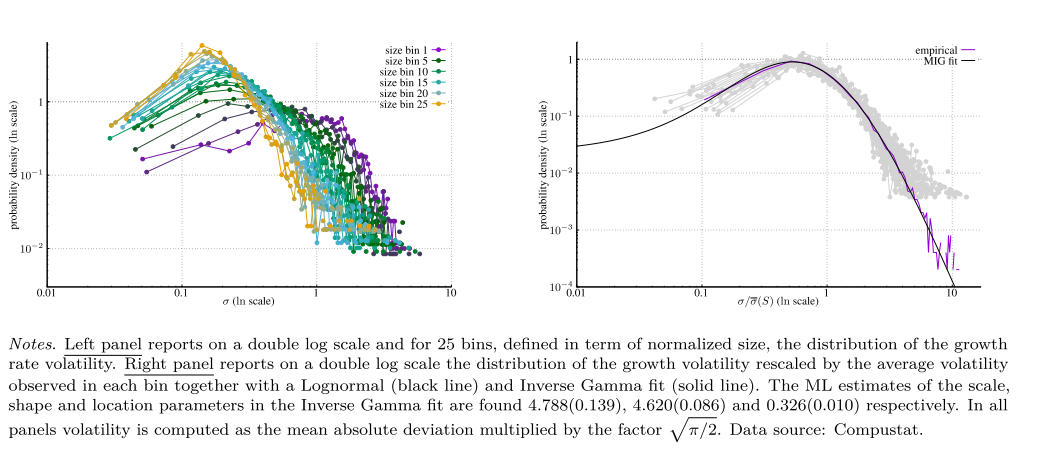 图2. 左图是生长率的波动,不同的曲线代表对企业规模取不同的 bin 值计算得到的生长波动;右图是按照平均规模 rescale 之后的结果。具体的数学操作请参考原文,这里不再对此展开。