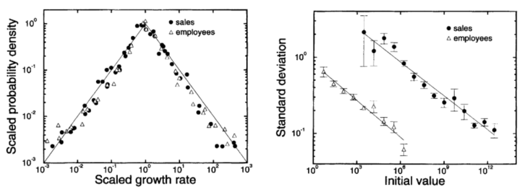 图1. 左图是企业生长率分布;右图是企业生长率波动和企业规模的幂律递减关系