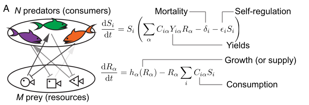 图1. 具有 N 个捕食者物种和 M 个被捕食者物种的最小模型。