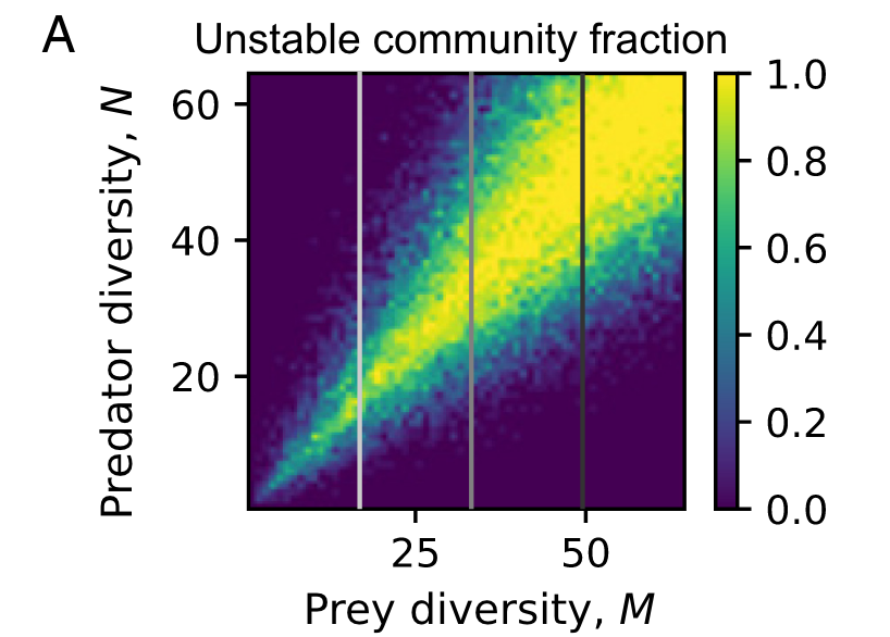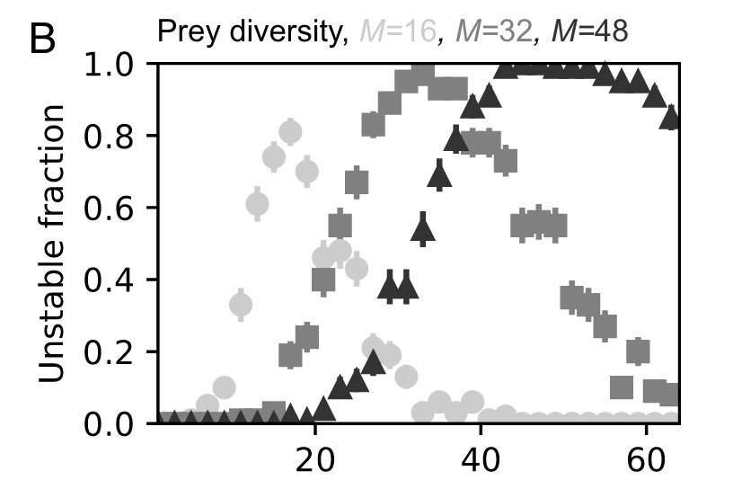 图4. 针对选定的猎物多样性 (M = 16, 32, 48) 更详细地绘制了不稳定群落所占比例。
