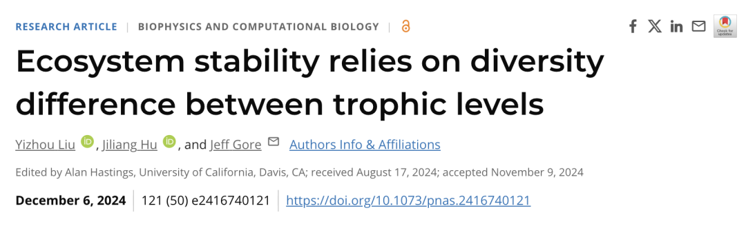 论文题目:Ecosystem stability relies on diversity difference between trophic levels