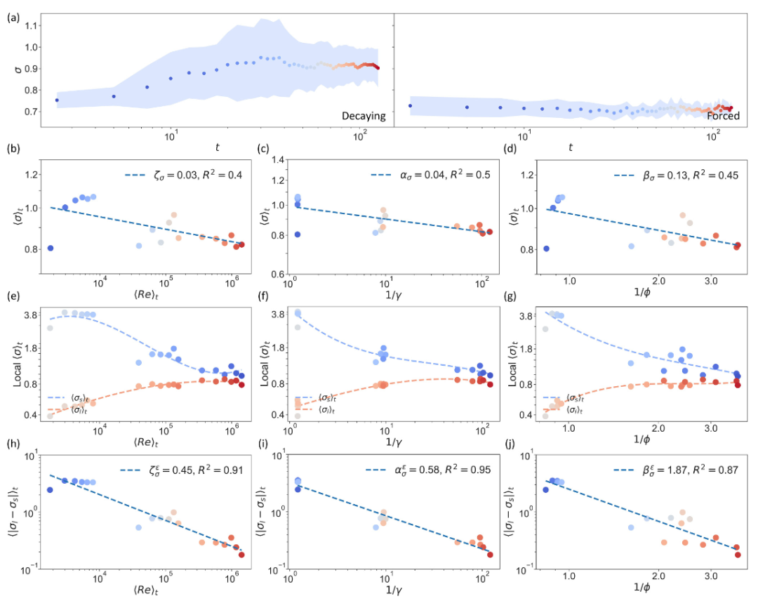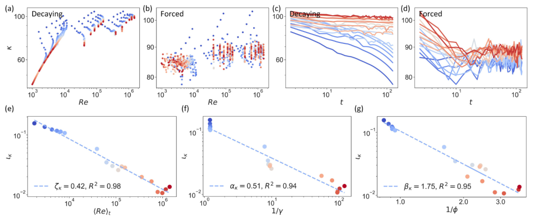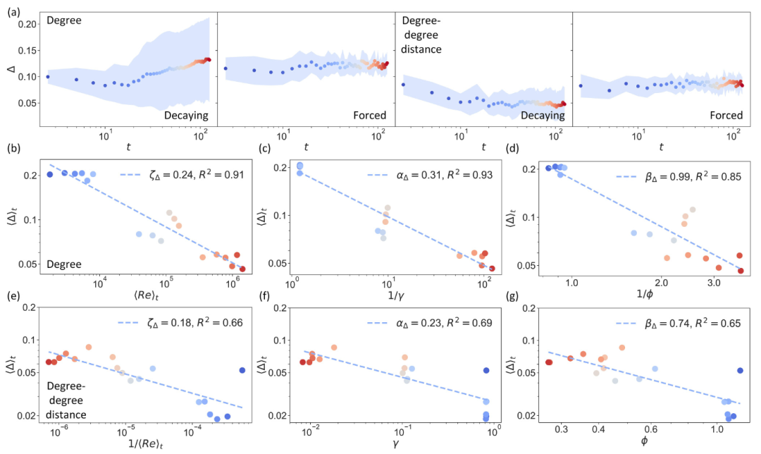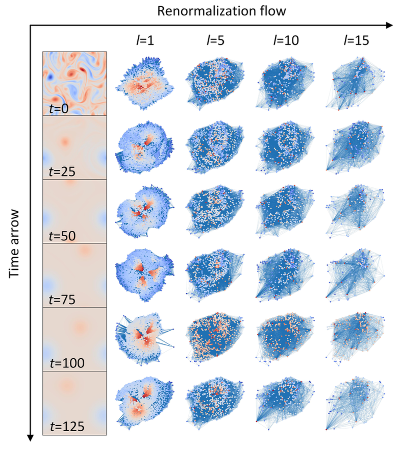 为了进一步探讨流体网络在不同尺度下的表现,研究对流体网络进行了重整化群(Renormalization Group, RG)变换,发现涡旋网络的尺度不变性在高湍流性条件下更强,体现为涡旋的多尺度结构。这表明,高湍流性流体系统更倾向于保留多尺度特性;而在低湍流性条件下,尺度不变性逐渐丧失。