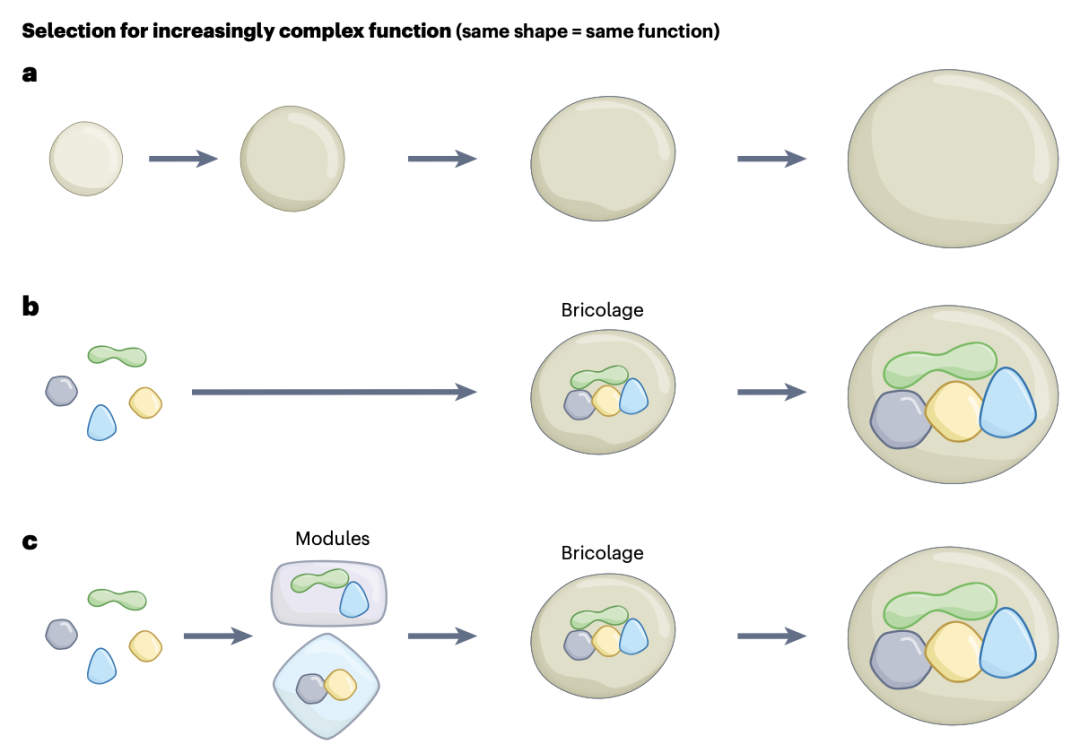 首先,研究者提出分子拼装的两阶段模型,将复杂系统的进化分为初始和组合阶段。在初始阶段阶段,各部件为了特定的早期功能而进化,如RNA、蛋白质或简单的分子,但这些功能与系统的最终功能无关。例如,早期tRNA可能仅作为催化的辅助因子,而非信息适配器。在组合阶段阶段,这些部件偶然形成粗糙的集合体,展现出新的功能,这种新功能为生物体提供适应性优势,从而受到自然选择的强化。