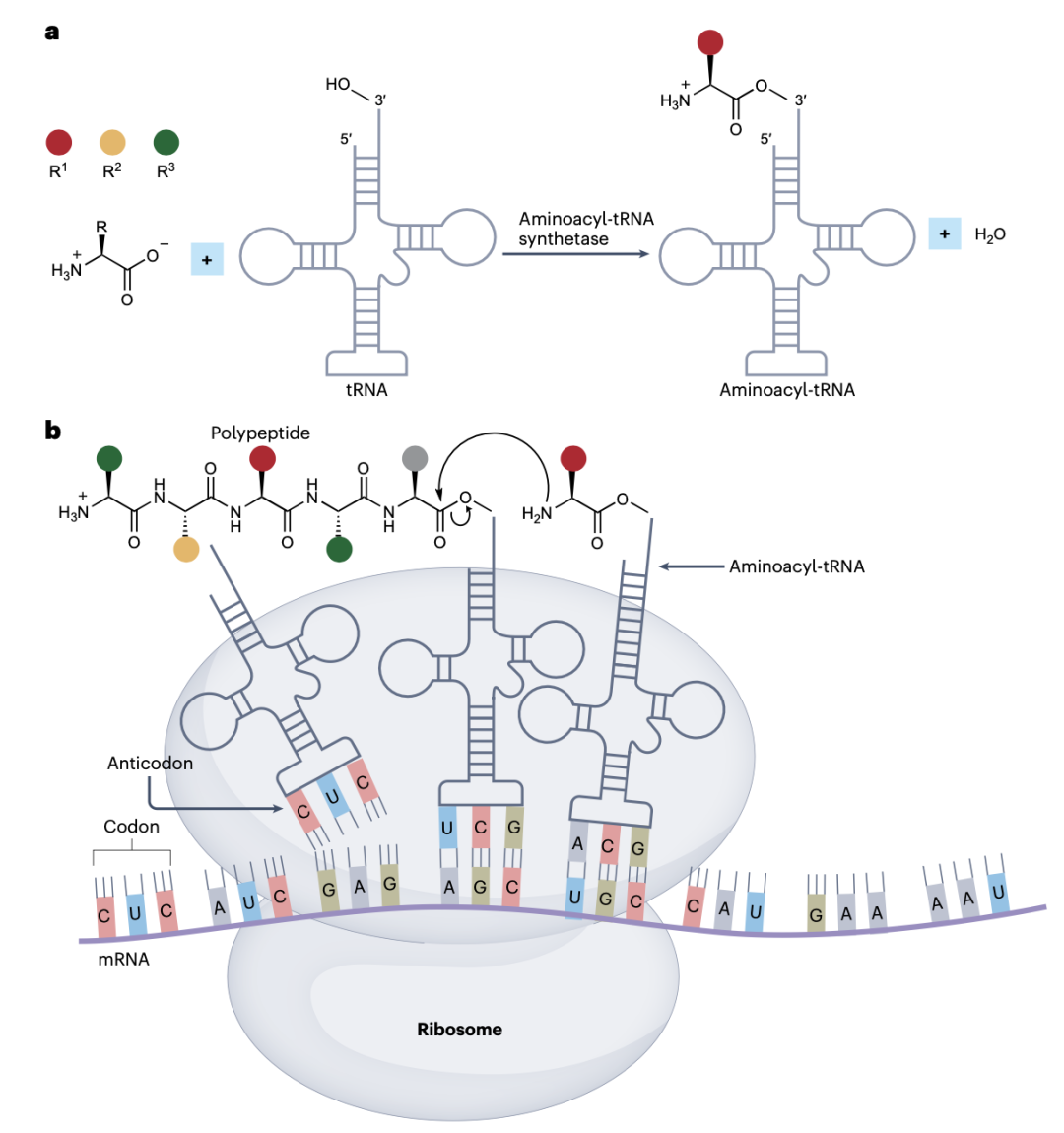 图 1. 现代的蛋白质翻译在所有已知的生命形式中都被保留下来,并且需要由许多相互作用的部分组成的复杂分子机器来实现。