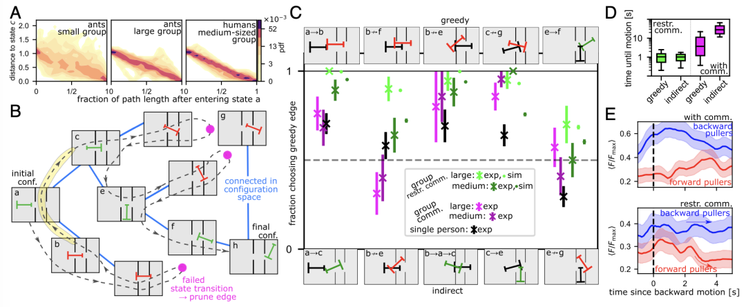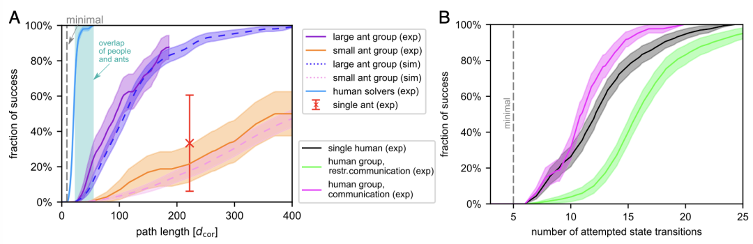 2. 集体记忆与协调:对蚂蚁而言,尽管单只蚂蚁无法理解谜题的全局结构,但大群体中的相互作用会产生短期的集体记忆,指导搬运的方向。对人类而言,由于个体具备更复杂的认知能力,人类更倾向于通过减少解空间来直接解决问题。然而,沟通不畅时,群体表现会因缺乏一致性而退化。