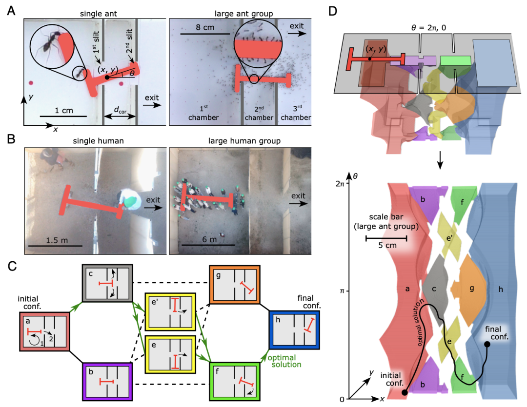 “搬钢琴”谜题要求参与者将一个复杂的T型物体从一个狭窄且充满障碍的迷宫中移动到目标位置。研究者调整了谜题的尺寸,使其适合蚂蚁(Paratrechina longicornis)和人类个体及群体完成。蚂蚁组设置单只蚂蚁、小群体(约7只蚂蚁)和大群体(约80只蚂蚁)三种规模条件;人类组设置单人、小组(6-9人)和大组(16-26人)三种规模,以及两种沟通条件(允许自由沟通和限制沟通)。通过这些条件的设置,研究者可以直接对比人类和蚂蚁的表现,还可以探讨群体规模和沟通对解决问题能力的影响。