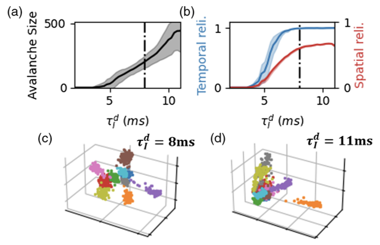 图 3. 不可靠的亚临界状态和僵硬的超临界状态。(a)最可靠雪崩中参与的神经元的平均数量(雪崩大小),随着抑制性突触时间参数的变化。(b)最可靠雪崩的时间可靠性(蓝色)和空间可靠性(红色),随着抑制性突触时间参数的变化。(c)(d)在每个输入信号下,最可靠雪崩的低维表示,展示临界状态和超临界状态的变化。不同颜色代表十个不同的输入信号,且相同颜色的不同点表示使用相同输入信号进行的不同实验。