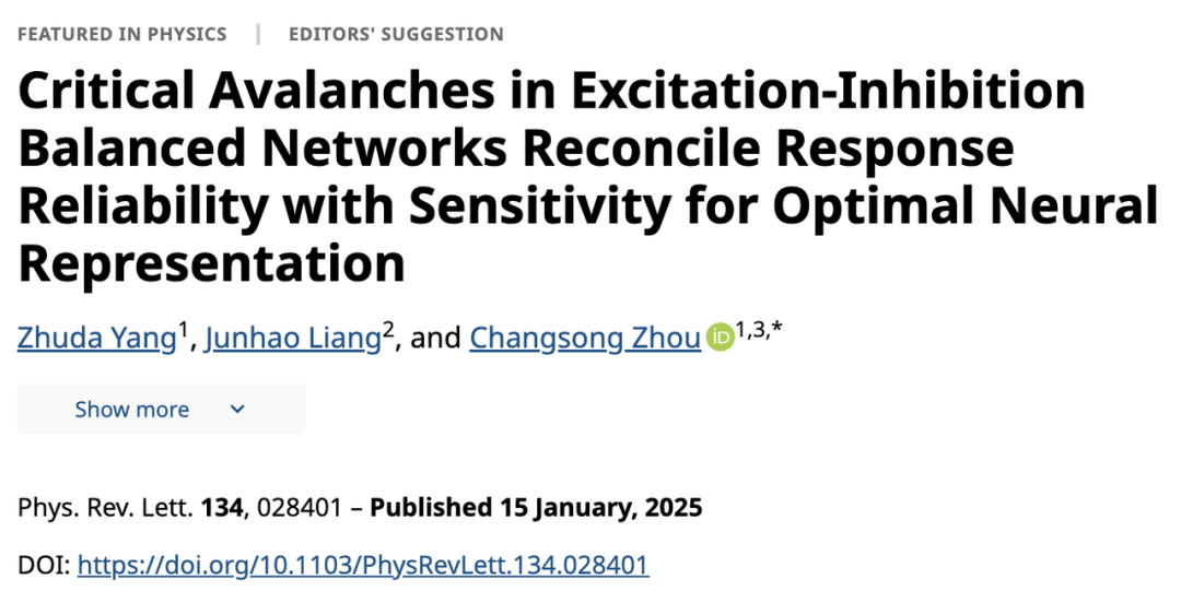 论文题目:Critical Avalanches in Excitation-Inhibition Balanced Networks Reconcile Response Reliability with Sensitivity for Optimal Neural Representation 论文地址:https://journals.aps.org/prl/abstract/10.1103/PhysRevLett.134.028401 期刊名称:Physical Review Letters