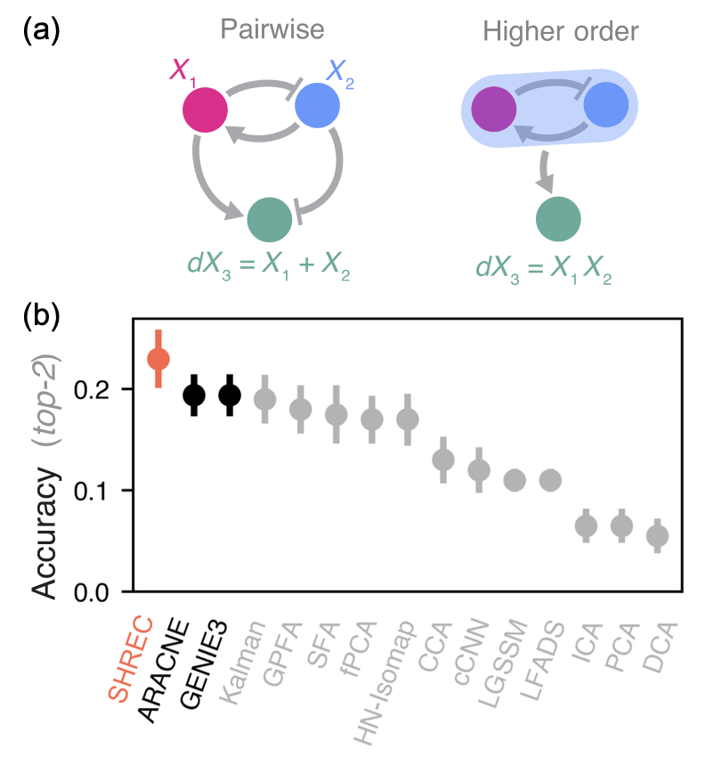 图 3. 共享重建识别高阶交互。(a)由两两相互作用驱动的动力学与单个乘法驱动的动力学。(b)网络推理方法在N个相互作用基因网络中识别两个乘法驱动节点的准确性。