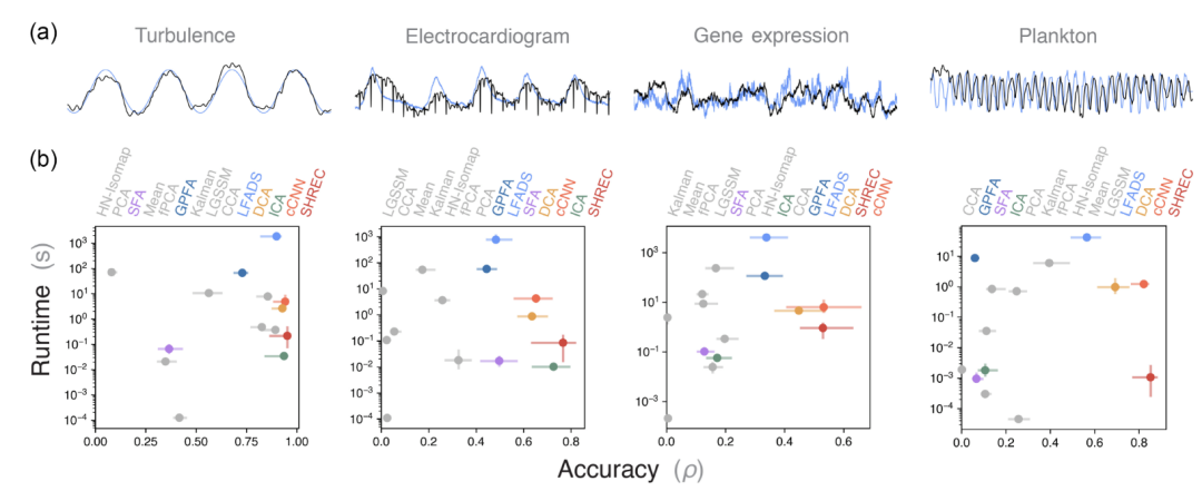 图 2. 将共享递归(SHREC)算法应用于不同的数据集。(a)四个不同实验时间序列的响应变量驱动信号示例(蓝色)及其重构(黑色)。(b)不同重建方法的运行时间与Spearman相关评分。