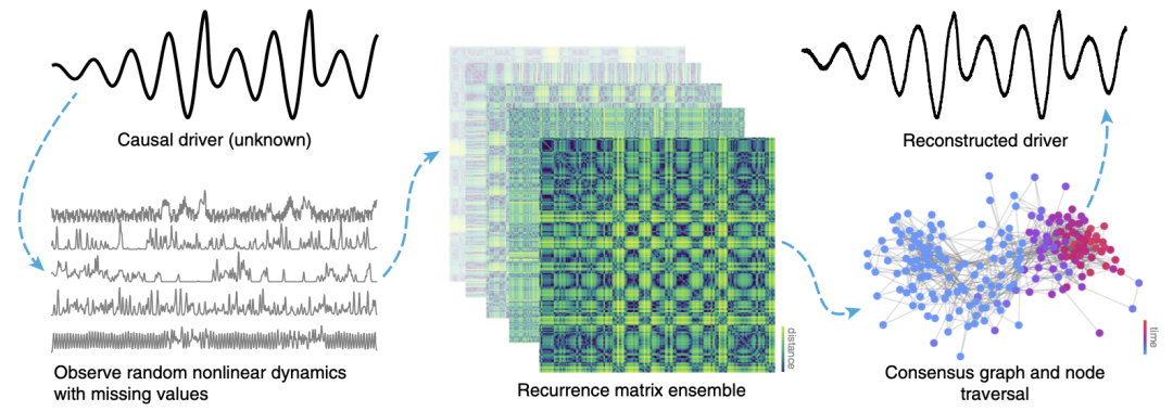 研究表明,当多个时间序列中出现同时递归事件时,可以揭示其共享的未观察到的驱动信号结构。文章介绍了一种基于物理的无监督学习算法,该算法通过迭代构建具有玻璃状结构的递归图来重建因果驱动信号。递归事件在由遍历性动力系统驱动的时间序列中逐渐揭示出关于驱动吸引子的结构信息。通过对经典信号处理和机器学习技术的广泛基准测试,证明了该方法能够从生态学、基因组学、流体动力学和生理学等多种实验数据集中提取因果驱动因素。