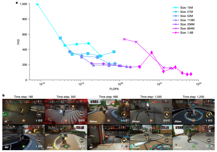 图 2. 一致性结果。(a)在训练计算预算(FLOPS)上的一系列WHAM大小的FVD。FVD适用于更大的模型和计算预算。(b)来自1.6B WHAM的两个示例代(每行一个)的关键帧。每代2分钟,表明1.6B WHAM能够产生长期一致的游戏玩法。