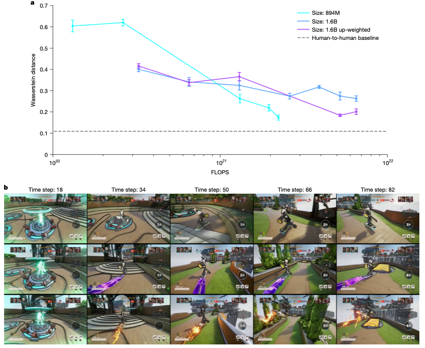 图 3. 多样性的结果。(a)通过与人类行为的Wasserstein距离来衡量的三种WHAM变体的多样性。在102,400个总动作(1,024个轨迹,每个轨迹有100个动作)中,我们对10,000个人类和模型动作进行子采样,并计算它们之间的距离。我们重复10次,并绘制平均值±1标准差。更接近于人与人之间的基线会更好。均匀随机动作的距离为5.3。所有的模型都可以通过训练来改进,并且可以通过增加动作损失的权重来进一步改进。(b)在相同的起始背景下产生的来自1.6B WHAM的三代的例子。我们看到了行为多样性的例子(玩家角色绕着刷出位置转,而不是直奔跳跃点)和视觉多样性的例子(玩家角色所乘坐的悬浮板有不同的皮肤)。