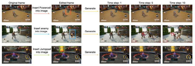 图 4. 编辑过程和定性持久性结果。成功持久性的示例包括Powercell、角色和垂直跳跃平台(Vertical Jumppad)。在我们的持久性评估中,WHAM的生成都是基于无操作(no-op)动作进行的,因此玩家角色和相机应该保持静止。示例中,插入的Powercell在1秒的生成过程中稳定持久,而插入的对手开始攻击玩家角色并造成伤害。垂直跳跃平台被插入到一个地图区域中,该区域在真实游戏和我们的数据中并未出现。然而,它在WHAM的生成过程中始终得以持久。
