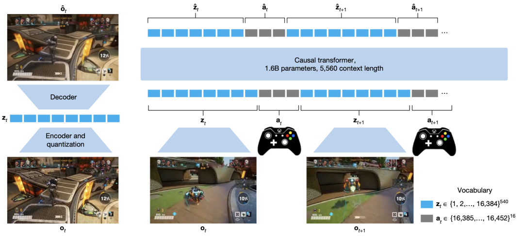 WHAM基于Transformer架构,以离散化token序列处理游戏画面(Frame)和手柄操作(Controller Action),其设计亮点包括: