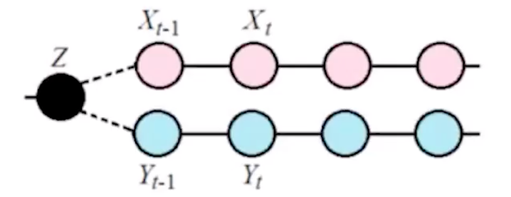 格兰杰因果在诸多领域有广泛的应用,不然也不会得诺贝尔奖了。那我为什么说这计算的不是真正的因果呢?看下面这张图。图中X和Y分别是两条时间序列,其中可以度量在控制住t-1时刻Y的情况下,t-1的X对t时刻的Y的预测能力。但假如有一个变量Z会同时影响X和Y两条序列的话,即使X对Y本身没有直接的因果关系,我们也可能计算出X显著地格兰杰导致Y。这里的Z,便被Judea Pearl称为混杂因子。格兰杰因果推断不能排除这种混杂因子的存在。