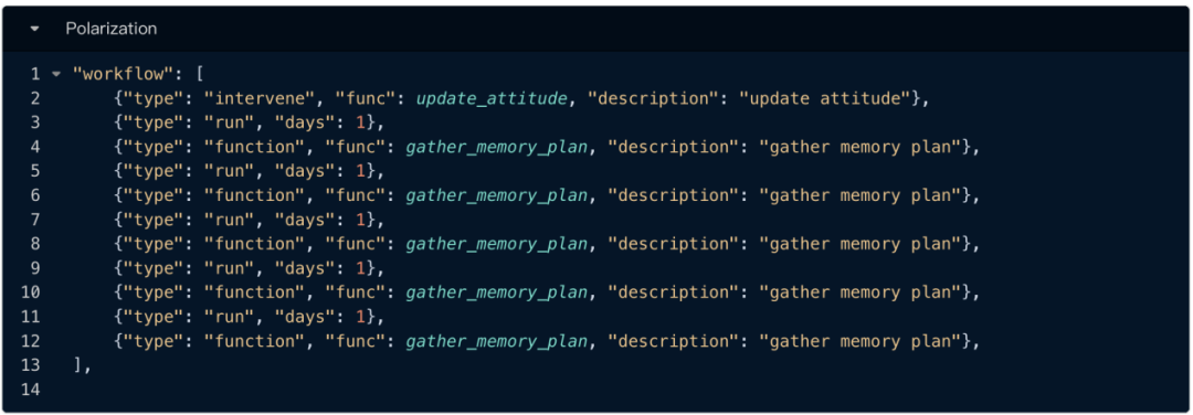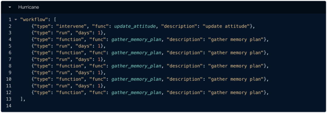 • 干预实验(Interventions):提供三种行为干预方式,测试社会情境下的个体与群体响应,包括:1)智能体配置:预设性格、目标和关系,影响初始行为倾向;2)记忆操控:修改情绪和认知,观察对决策与社交互动的影响。3)外部信息干预:发送特定信息(如灾害预警)测试应急响应与传播模式。
