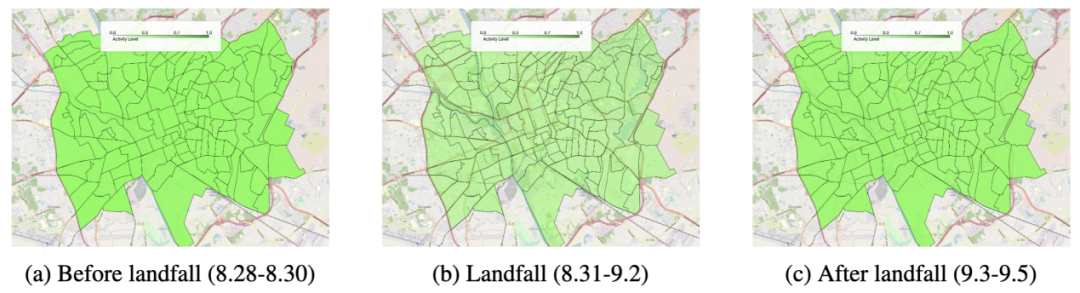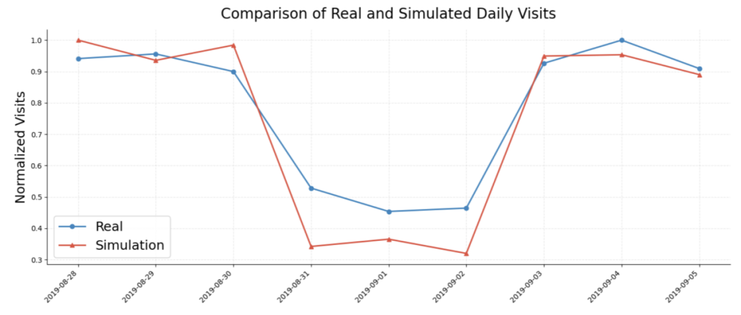 实验结果显示,模拟智能体在飓风事件中的移动模式与真实数据高度一致,活动水平随飓风来临大幅下降,并在灾后逐步恢复,符合实际人群出行趋势。模拟数据与真实人口流动的时间演化相似,验证了模拟器在复现极端天气下人类行为的有效性,为优化灾害应对策略提供支持。