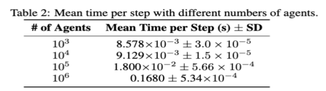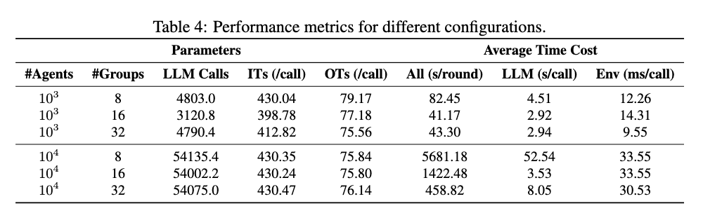 上表展示了随着智能体数量增加,系统在分布式计算下的可扩展性及性能表现。实验表明,令牌使用模式(包括输入和输出)保持稳定,分布式并行框架能够有效支持大规模智能体的执行,充分利用多核计算能力,成功缓解了CPU瓶颈,确保了系统的可扩展性。同时,实验结果也表明,在完全并行的条件下,执行效率主要受限于大模型API调用的性能。