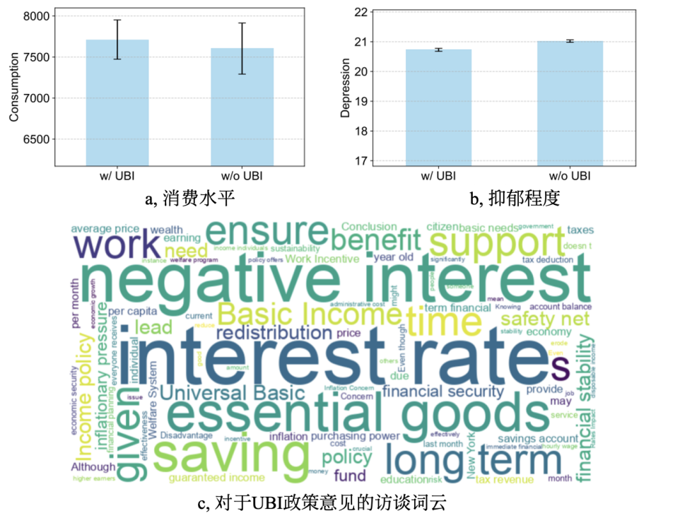 实验结果显示,模拟中的经济系统随着时间推移逐渐稳定,实际GDP和智能体消费水平的波动逐渐缩小。团队在第96步引入了UBI政策,并比较了接下来24步内的经济和社会指标,具体包括智能体消费水平和抑郁水平(使用CES-D量表进行调查问卷评估)。结果表明,UBI政策显著提高了消费水平并降低了抑郁水平,这与德州UBI政策的影响相似,验证了模拟的现实性。此外,通过对智能体的访谈,分析了它们对UBI政策的看法。访谈结果显示,UBI政策的影响与利率、长期福利、储蓄和生活必需品等关键因素密切相关,反映了现实中公众对UBI政策的普遍认知。这些结果一方面支持了UBI政策在提高消费和改善心理健康方面的效果,另一方面也证明了模拟器作为低成本实验场地验证政策的有效性。