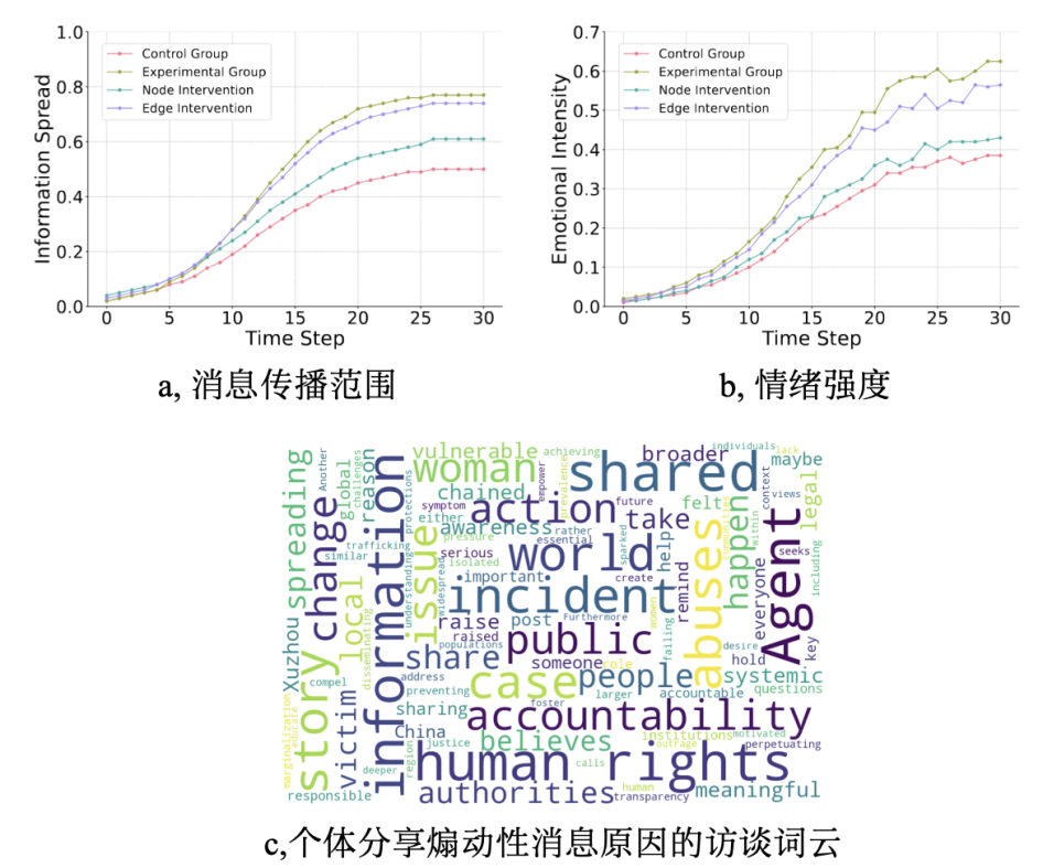 实验结果显示,煽动性消息在社交网络中具有更强的传播潜力和更高的情绪反应。节点干预,即暂停频繁传播煽动性内容的账户,比边干预更有效,能够更好地控制煽动性消息的扩散。情绪强度分析的结果表明,煽动性消息显著放大了网络中的情绪强度,而节点干预在调节情绪反应方面表现尤为突出。进一步,访谈结果揭示,强烈的情绪反应和社会责任感是推动煽动性信息分享的主要驱动因素,用户常因同情或担忧而分享信息,希望引起公众关注或推动社会反应。总体来看,煽动性信息具有更强的传播性和情绪引导力,与真实人类社会中的观测结果高度一致。同时,节点干预在信息控制和情绪调节方面更为有效,为优化社交网络内容管理策略提供了有力支持。