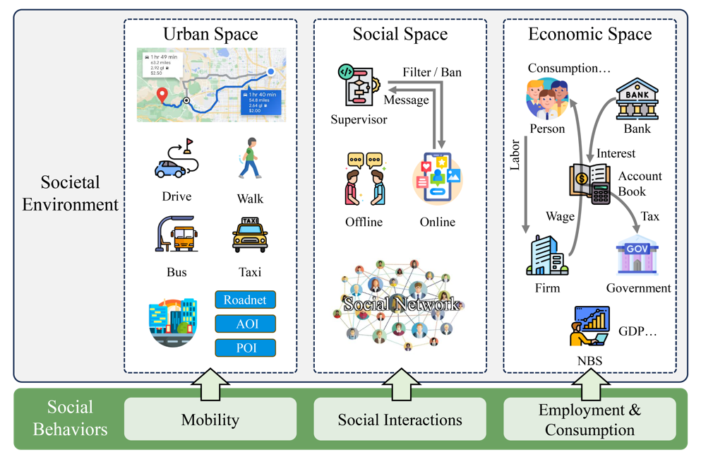 真实城市社会环境:精准模拟社会人赖以生存的城市空间,重现交通、基础设施和公共资源,使智能体能在真实环境约束下交互,形成逼真的社会生态。