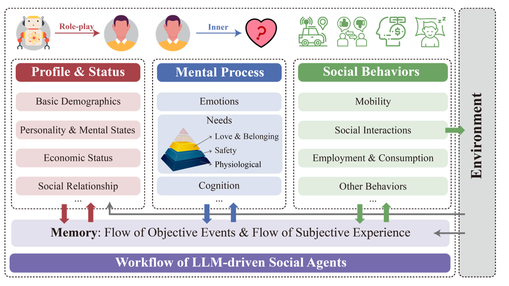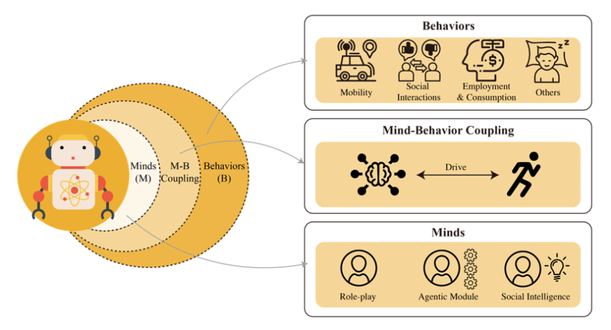 大模型驱动的社会人智能体:基于社会学理论,构建具有 “类人心智”的社会人智能体,赋予其情感、需求、动机与认知能力,并在这些心智驱动下进行复杂社会行为,如移动、就业、消费、社交互动等。