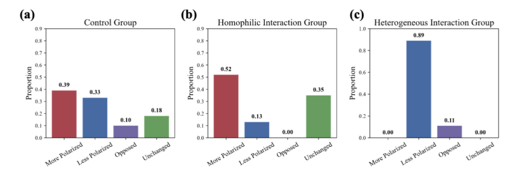 如上图所示,针对枪支管控这一政治议题,三种实验设置下的观点变化呈现出明显的差异。在对照组中,智能体之间进行自由讨论,没有外部干预,结果显示39%的智能体在互动后变得更加极化,而33%的智能体则倾向于持更加温和的观点。与此相比,在同质信息组中,观点极化现象更加显著,52%的智能体的观点变得更加极端。这表明,与志同道合的个体过度互动可能会加剧观点的极化,即真实世界中常见的“回音室效应”。而在对立信息组中,89%的智能体的观点变得更加温和,11%的智能体甚至被说服接受了对立的观点。这表明,接触到不同意见的内容能够有效缓解观点极化,或可成为应对极化现象的一种有效策略。