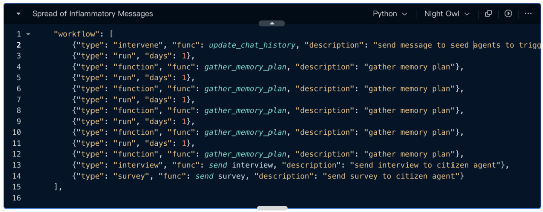 煽动性消息指包含极端观点或误导性信息的内容,这类信息在社交网络中的快速传播可能加剧群体冲突,影响公共讨论环境。本实验模拟 煽动性信息在社交网络中的传播,并测试不同的内容治理策略对其扩散模式和群体情绪的影响。实验包括对照组和煽动性信息组:在对照组中,智能体仅传播普通信息,团队观察其自然扩散过程及情绪演化。在煽动性信息组,团队引入带有强烈情绪表达的煽动性内容,分析其对信息传播速度和群体情绪的影响。针对煽动性信息传播的治理,团队设计了节点干预和边干预 两种策略,其中节点干预 通过检测并封禁反复传播煽动性内容的账户、以减少信息源头,边干预则在发现煽动性内容传播时切断社交连接,以遏制其扩散。实验还通过与智能体的交互式访谈探究个体在分享煽动性消息时的心理动因。在模拟器中开展该实验的配置如下,