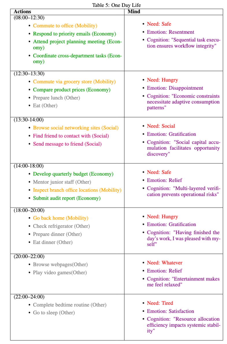 为了验证智能体的自主决策能力及其行为模式的合理性,团队模拟了社会人智能体的一日生活,观察其在移动、社交和经济活动 方面的决策和适应能力(如下表所示)。通过 24 小时的仿真,智能体在需求、情感和认知 的驱动下自主规划日常任务,并动态调整行为,以符合现实社会中的时间节奏和互动逻辑。