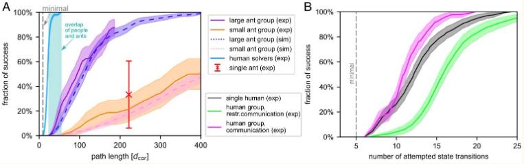 图 2:蚂蚁与人类的解谜效率对比。(A) 路径长度对比:横轴代表解谜过程中行走的标准化路径长度,纵轴代表成功解谜的尝试比例。曲线越靠左上方,效率越高。可见,人类效率最高,但其中存在与大型蚁群重合的部分,小型蚁群和单只蚂蚁效率较低。(B) 状态转移次数对比:横轴代表解谜过程中尝试的状态转移次数,纵轴含义同 A 图。限制沟通的人类群体效率最低,允许自由沟通的人类群体略优于单个人类,但提升不显著。图中数据来源于实验和模型模拟。