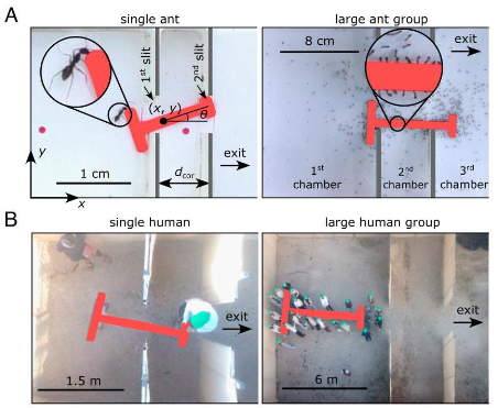 图1. 搬钢琴迷题示例,A 左:单只蚂蚁,右:蚁群;B 左:单人,右:人类群体