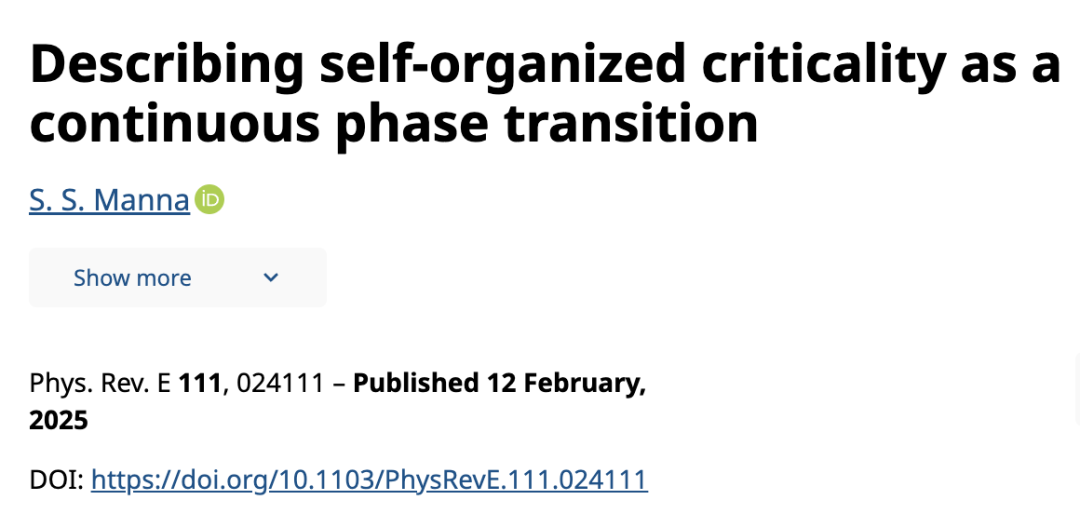 论文题目:Describing self-organized criticality as a continuous phase transition 发表时间:2025年2月12日 论文地址:https://journals.aps.org/pre/abstract/10.1103/PhysRevE.111.024111 期刊名称:Physical Review E