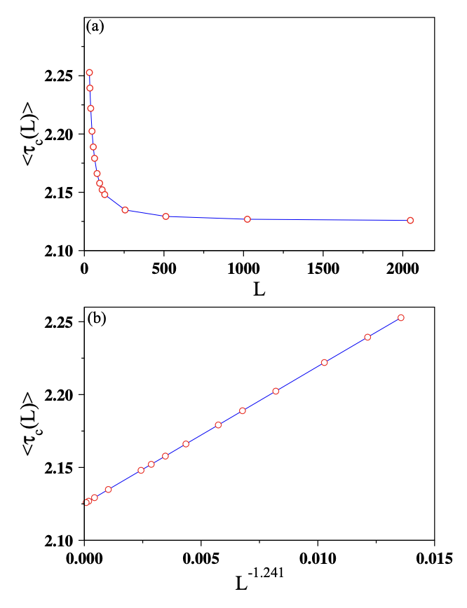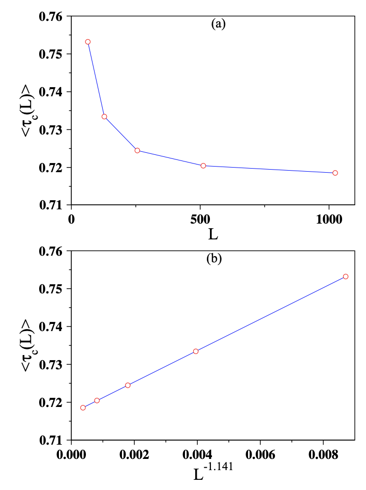 图 2. Manna模型:(a)利用跨越型雪崩估算了临界掉落密度的平均值。(b) 临界掉落密度的平均值已在L-1.141上绘制,以获得最佳拟合直线,该直线外推τc = 0.7170和1/ν= 1.141。