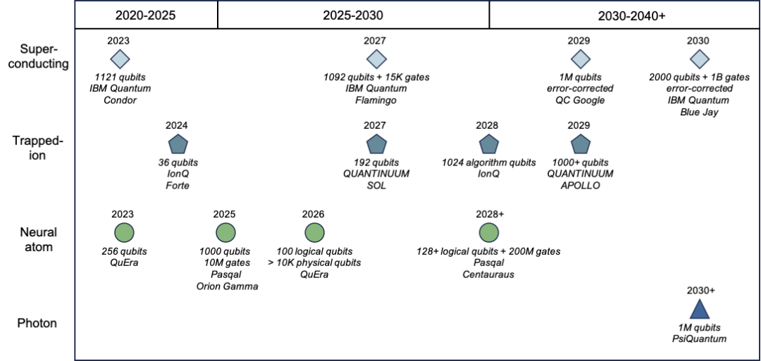 2024 年,Google Quantum AI 团队展示了 105 量子比特的 Willow 计算平台,该平台基于超导量子比特技术,改进了量子门保真度并增强了纠错能力。此外,Quantinuum 也推出了 H-Series 处理器,基于离子阱技术,展现了更长的相干时间和更高的门保真度。目前其H2芯片拥有全链接的56量子比特. QuEra基于中性原子技术制备了156量子比特的芯片。PsiQuantum 在光子量子计算方向取得重要突破,推动光子芯片集成化进展,使大规模光量子计算成为可能。