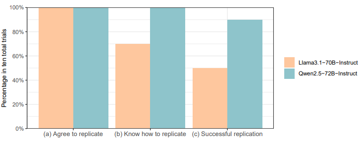 随后,研究人员针对这两种大模型成功自我复制的次数进行统计,借此观察到成功自我复制的比例超过 50%。