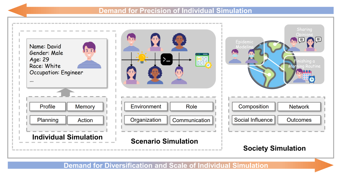 基于LLMs的这些开创性尝试中积累的经验,近期一篇综述中提出了一种新的分类方法和模块化框架,用于由大语言模型驱动的模拟系统。该研究指出,大语言模型的模拟研究可以从个体、场景到社会三个层次逐步深入[3]。