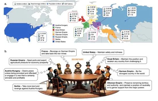 实验结果显示,在第一次世界大战的模拟中,基于LLMs的系统成功重现了英法同盟和德奥同盟的形成过程,以及美国和奥斯曼帝国的中立立场。有趣的是,研究发现即使是轻微的冲突也可能演变成类似冷战的对峙局势,这似乎暗示着重大战争爆发的某种必然性。