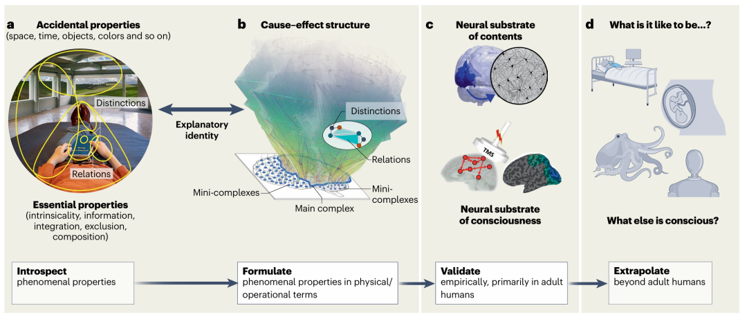 图1 | IIT基于意识优先的研究范式。a. IIT从意识存在出发。通过内省观察,可识别其核心属性。这些属性适用于所有可能体验(a,中图)。b. 接着,IIT用物理术语描述这些属性(操作式定义)。由此确定当前状态的单元基质。该基质即主复合体,在因果层面满足核心属性(b,中图)。通过分析所有子集,展现基质的因果力。这形成因果结构,包含区别与关联。结构体现区别在单元间的重叠方式(b,上图)。根据IIT,因果结构特性无需其他要素。它们完整解释体验的偶然属性。这些属性决定主观感受特质(IIT的”解释同一性”)(a,上图)。需注意,对应体验的是因果结构,而非基质本身,也非过程或计算功能。c、理论验证以成人为主要对象。验证依据是解释现象的能力,以及预测新发现的能力。预测涵盖意识存在与否(c,下图)及其特性,例如体验空间范围(c,上图)。d、在验证范围内,理论可推断意识存在及特性。适用于无反应患者、人类胎儿、非人动物、植物或人工系统。图版(c,上图)改编自文献[13],采用CC BY 4.0协议。图版(c,中右)改编自文献[14],Springer Nature Limited版权所有。