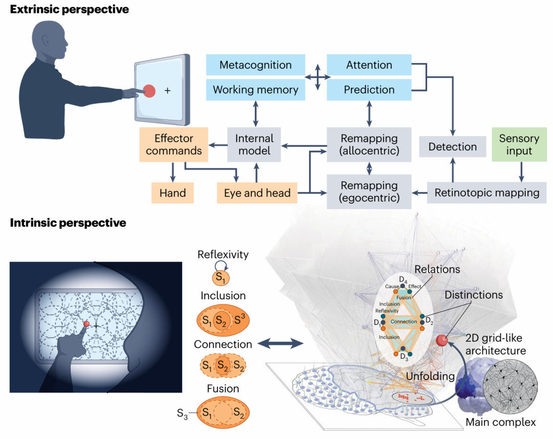 整合信息论理论的核心主张是:意识体验属于结构,而非功能。举例来说,假设某人注视屏幕中心,按要求指向光点(见方框图示左上)。神经科学的主要目标在于理解大脑如何完成这类感觉运动转换——即执行功能的计算过程。具体描述如下(见方框图示右上):刺激物(红点)的位置在初级视觉皮层进行视网膜拓扑映射。不同层级的脑区解码并重新编码,将坐标从视网膜参照系转为空间坐标系。随后信号经顶叶区域处理,涉及眼-头-躯干的内部模型,最终生成运动指令。这些指令通过前运动皮层调控肢体动作和注视。预测过程可能影响刺激信号的传递。注意机制则会聚焦刺激位置,促进检测和后续行为处理。工作记忆与元认知可能参与评估任务表现。通过将计算步骤映射到神经回路,可以理解大脑如何处理空间信息并产生适应性行为,类似工程师分析机器人系统。该方法在揭示大脑工作机制上非常成功(需注意:作为生物演化系统,大脑功能与计算难以简单对应)