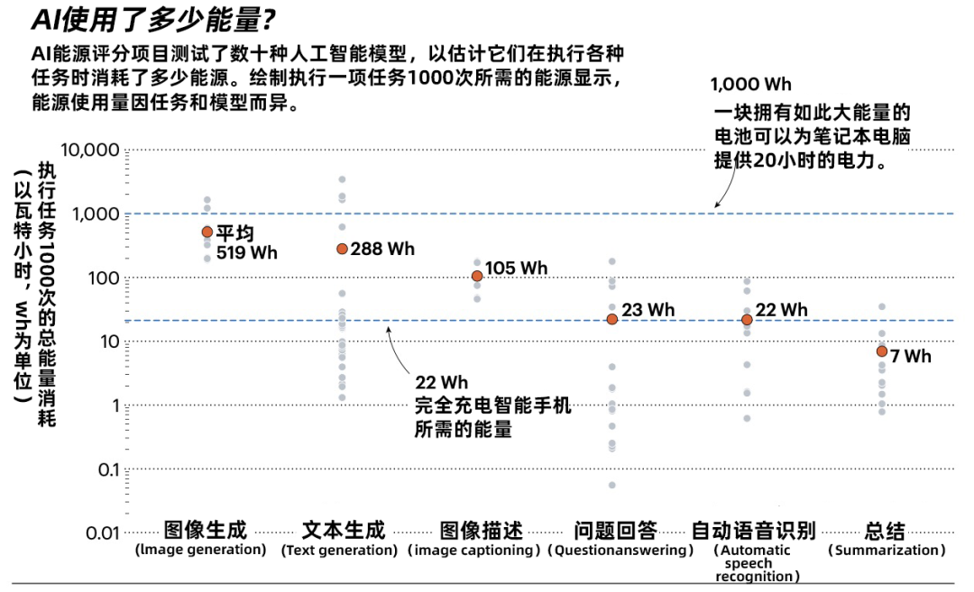 卢西奥尼和其他人发现不同的任务需要不同的能量。根据他们最新的结果,平均而言,根据文本提示生成图像大约消耗0.5 Wh的电力,而生成文本则略少。作为比较,现代智能手机充满电大约需要22 Wh。但存在很大的差异:较大的模型需要更多的能量(参见‘AI使用多少能量?’)。德弗里斯说,这些数字低于他论文中的数字,但这可能是因为卢西奥尼等人测试用的模型至少比支持ChatGPT的模型小一个数量级,以及AI变得越来越高效。