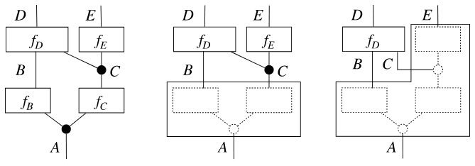 根据前文的内容,我们可以给出这个例子的弦图表示[8]。对称幺半范畴的性质告诉我们,你可以把产生LDL和HDL的两个模块以及复制子(不要落下它)拼接成为一个模块。如前文所述,如果马尔可夫条件不满足,这个过程的逆过程不一定成立。