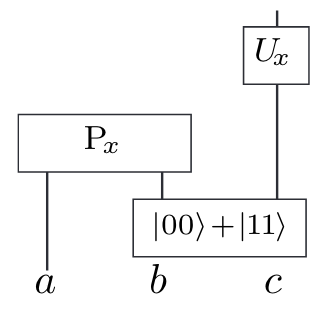 弦图看起来比较古怪,但其实它正好可以用来表示量子计算的过程[5]。在量子电路中,每一个量子比特对应一条线,每一次可逆计算(Ux)和观测(Px)都对应一个方块。只不过通常量子电路图按操作顺序是从左向右排列,按照弦图则是从下往上。