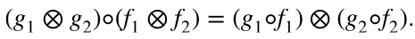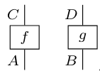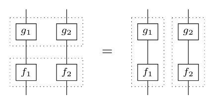 弦图这个工具对应到范畴论的语言,描述的是对称幺半范畴(symmetric monoidal category)。不了解范畴论的读者可以把对称幺半范畴想象成用积木搭建起的世界,每块积木对应一个机制。两块积木可以左右拼接起来(机制并行存在),而且拼接的顺序可交换。另外,积木还可以上下串联起来,也就是机制之间的复合。而且复合和拼接的顺序可交换。这个性质的图形和公式描述如下: