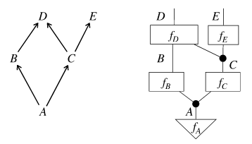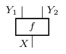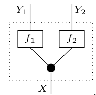 通过上面的介绍,我们已经知道了如何用范畴论的弦图规范地表示因果模型。截至目前,我们使用的例子都是离散的因果模型,而且它们都满足马尔可夫条件。考虑一个机制,有一个输入和两个输出: